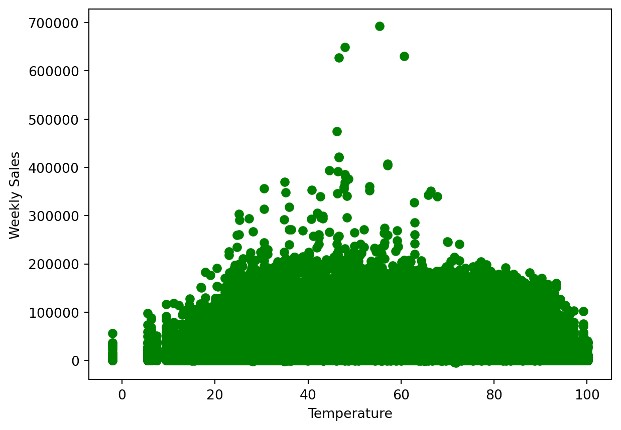 Now let’s look at the temperature on the days of sales and whether that plays a role in how weekly sales are affected.