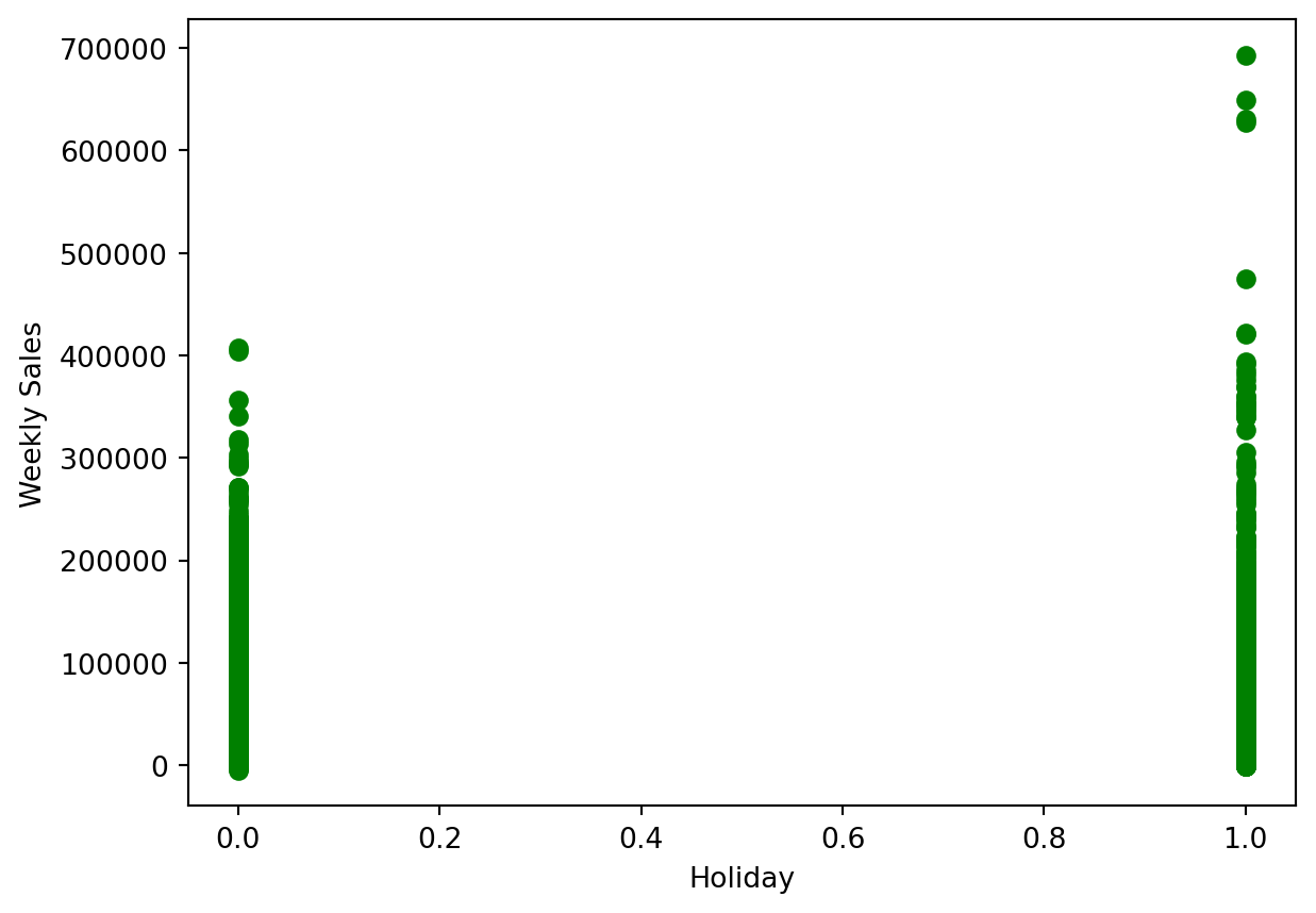 Now let’s see how the holidays drive weekly sales. A holiday is represented by 1, and a non-holiday is represented by 0.